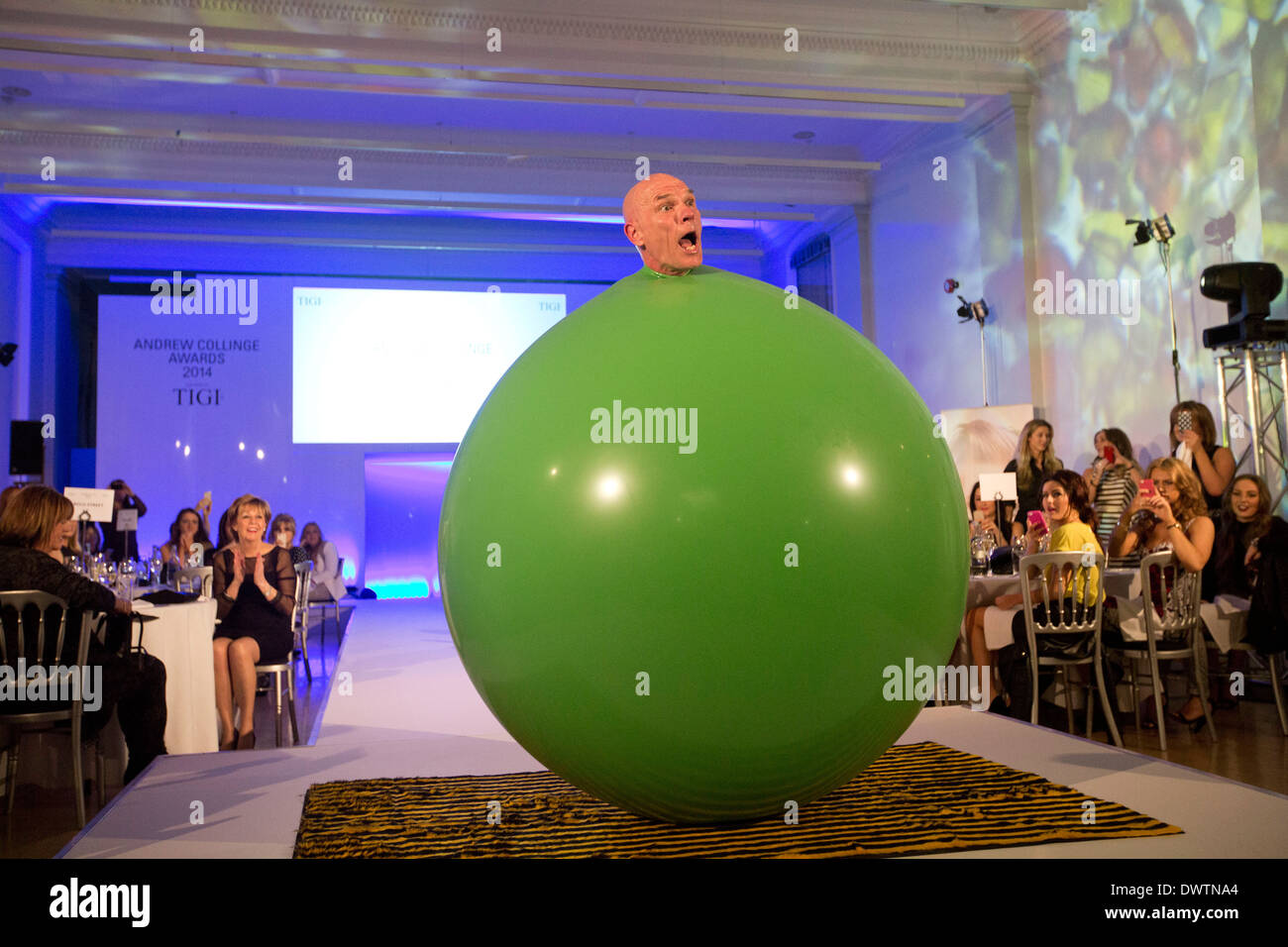 An illusionist with a giant green balloon during a corporate performance in Live