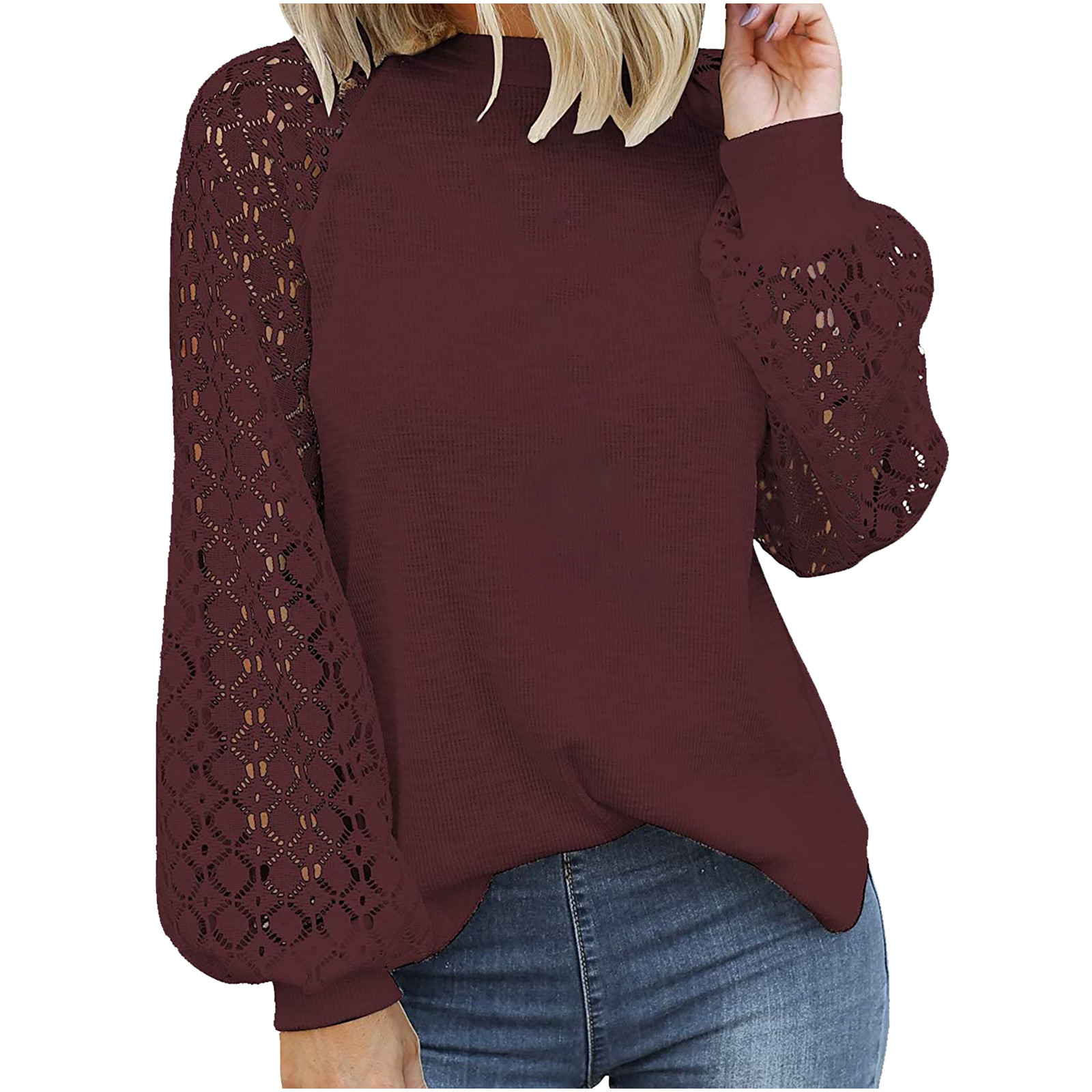 Женский кружевной топ с длинным рукавом и круглым вырезом, свободный однотонный