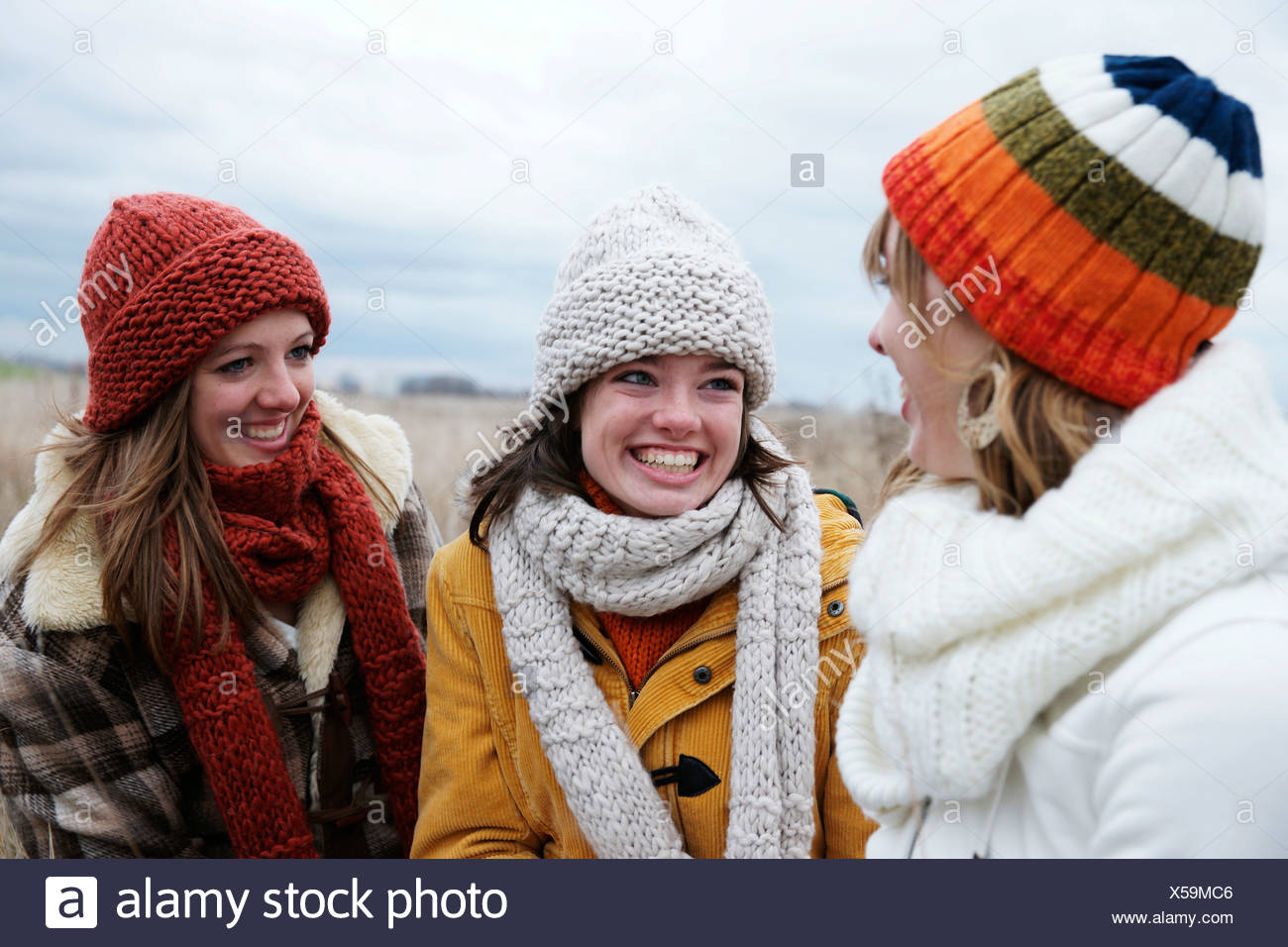 Three laughing teenage girls wearing hats and scarfs Stock Photo - Alamy
