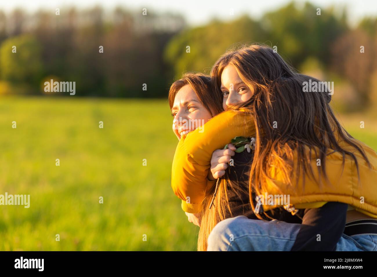 Playful mother giving daughter piggy back ride at green field. Both laughing and